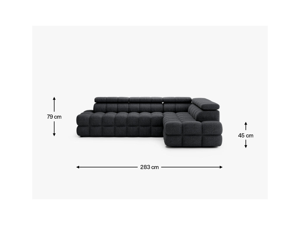 Rohová pohovka Buffalo je perfektní volbou pro ty, kteří očekávají nejen pohodlí, ale také osobitý charakter a vytříbený tvar. Zaoblené, měkké linie a dekorativní, hluboké prošívání vytvářejí pocit moderní lehkosti v kombinaci se sochařským povrchem – kus, který přitahuje pozornost a dodává každému interiéru jedinečný nádech. Pohodlí lehátka je založeno na pečlivě vybrané konstrukci: vysoce kvalitní pěna, vlnité pružiny a čalounické popruhy, díky nimž sedáky kombinují měkkost s dostatečně stabilní oporou. Hloubka sedáku (57 cm) a šířka (236 cm) zajišťují pohodlí jak pro každodenní relaxaci, tak i pro delší odpočinek.