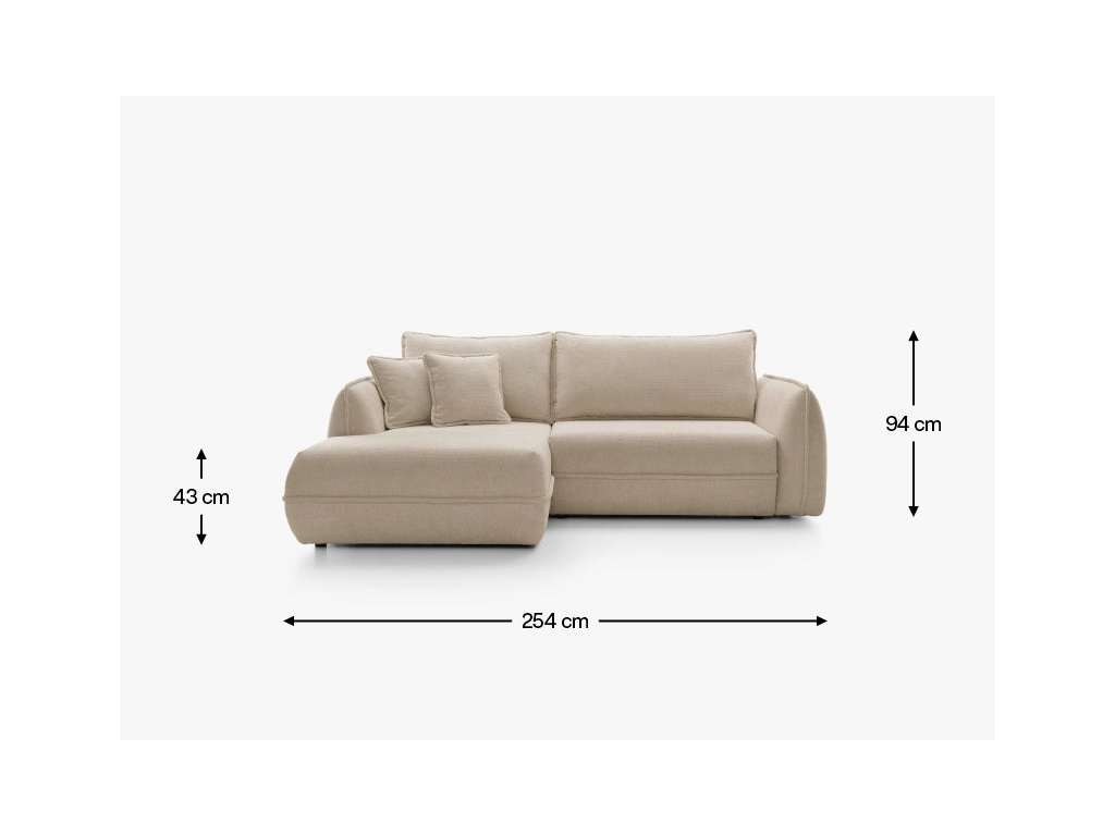 Rohová pohovka Moho kombinuje moderní, klidnou estetiku s praktickými řešeními, která jsou ideální pro každodenní použití. Její zaoblený, měkký tvar a zaoblené područky dodávají každému interiéru útulný charakter a relaxační atmosféru. Díky harmonickým liniím se perfektně hodí jak do světlých, minimalistických interiérů, tak i do klasičtějších prostor. Tato rohová pohovka s šířkou 254 cm nabízí dostatek prostoru pro relaxaci, zatímco pohodlná rohová část o hloubce 162 cm vám umožní se protáhnout a relaxovat. Šířka sedáku 195 cm a pohodlná hloubka polštáře 63 cm zajišťují pohodlí jak při sezení, tak i při delším odpočinku. Měkká opěradla a polštáře podporují relaxaci a navozují útulnou atmosféru.