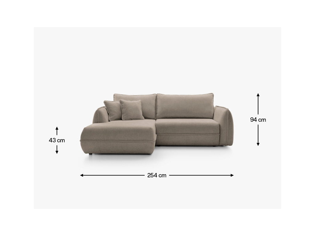 Rohová pohovka Moho kombinuje moderní, klidnou estetiku s praktickými řešeními, která jsou ideální pro každodenní použití. Její zaoblený, měkký tvar a zaoblené područky dodávají každému interiéru útulný charakter a relaxační atmosféru. Díky harmonickým liniím se perfektně hodí jak do světlých, minimalistických interiérů, tak i do klasičtějších prostor. Tato rohová pohovka s šířkou 254 cm nabízí dostatek prostoru pro relaxaci, zatímco pohodlná rohová část o hloubce 162 cm vám umožní se protáhnout a relaxovat. Šířka sedáku 195 cm a pohodlná hloubka polštáře 63 cm zajišťují pohodlí jak při sezení, tak i při delším odpočinku. Měkká opěradla a polštáře podporují relaxaci a navozují útulnou atmosféru.