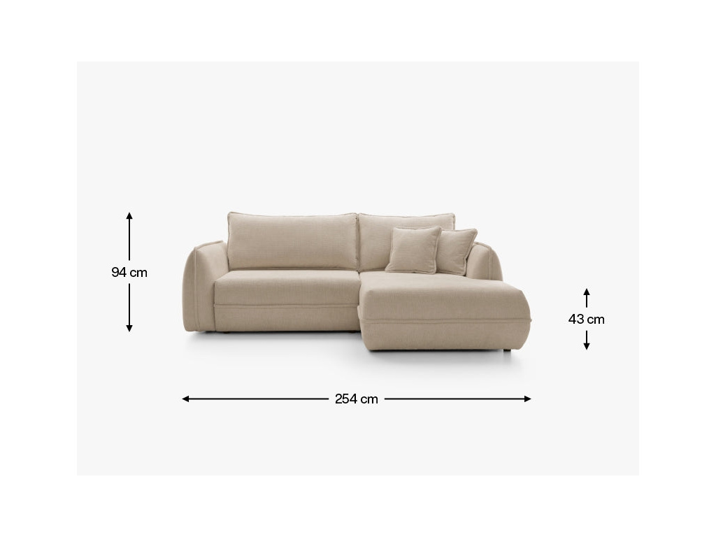 Rohová pohovka Moho kombinuje moderní, klidnou estetiku s praktickými řešeními, která jsou ideální pro každodenní použití. Její zaoblený, měkký tvar a zaoblené područky dodávají každému interiéru útulný charakter a relaxační atmosféru. Díky harmonickým liniím se perfektně hodí jak do světlých, minimalistických interiérů, tak i do klasičtějších prostor. Tato rohová pohovka s šířkou 254 cm nabízí dostatek prostoru pro relaxaci, zatímco pohodlná rohová část o hloubce 162 cm vám umožní se protáhnout a relaxovat. Šířka sedáku 195 cm a pohodlná hloubka polštáře 63 cm zajišťují pohodlí jak při sezení, tak i při delším odpočinku. Měkká opěradla a polštáře podporují relaxaci a navozují útulnou atmosféru.