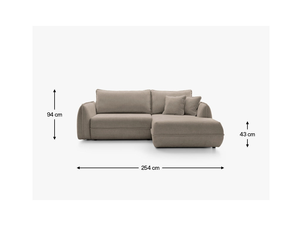 Rohová pohovka Moho kombinuje moderní, klidnou estetiku s praktickými řešeními, která jsou ideální pro každodenní použití. Její zaoblený, měkký tvar a zaoblené područky dodávají každému interiéru útulný charakter a relaxační atmosféru. Díky harmonickým liniím se perfektně hodí jak do světlých, minimalistických interiérů, tak i do klasičtějších prostor. Tato rohová pohovka s šířkou 254 cm nabízí dostatek prostoru pro relaxaci, zatímco pohodlná rohová část o hloubce 162 cm vám umožní se protáhnout a relaxovat. Šířka sedáku 195 cm a pohodlná hloubka polštáře 63 cm zajišťují pohodlí jak při sezení, tak i při delším odpočinku. Měkká opěradla a polštáře podporují relaxaci a navozují útulnou atmosféru.