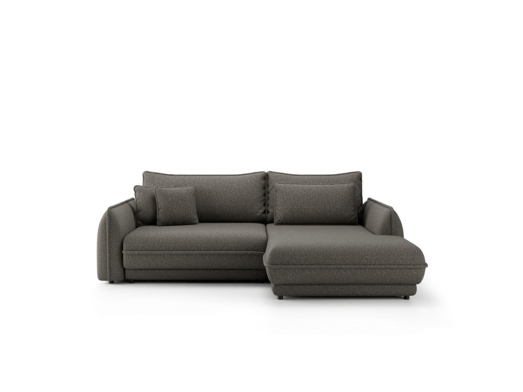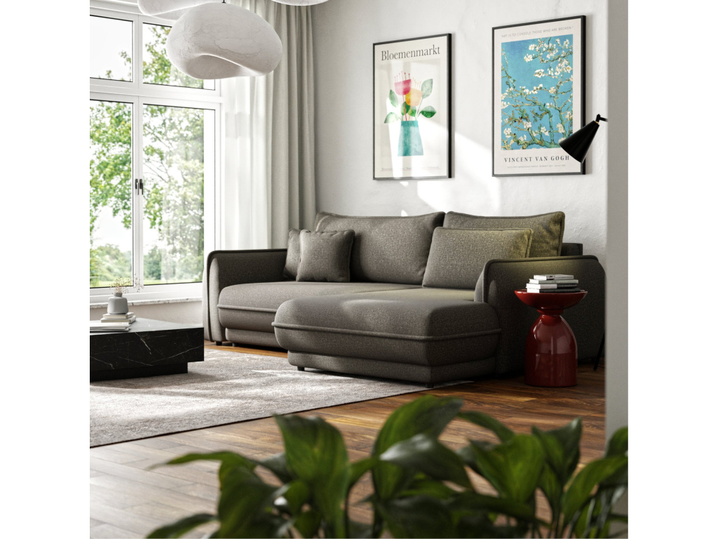 Díky intuitivnímu rozkládacímu mechanismu se rohová pohovka během několika okamžiků promění v pohodlnou postel o rozměrech 214 x 160 cm, ideální pro každodenní i občasnou noční relaxaci. Praktický prostor na ložní prádlo umožňuje snadné uložení dek a polštářů, což pomáhá udržovat obývací pokoj v pořádku.
