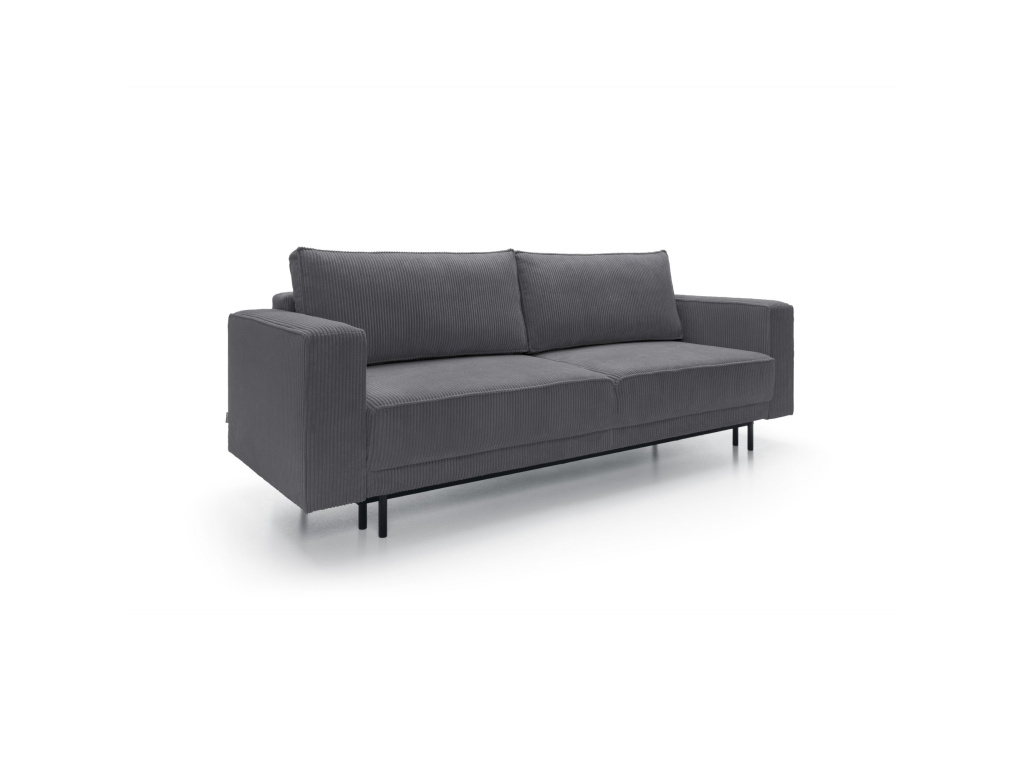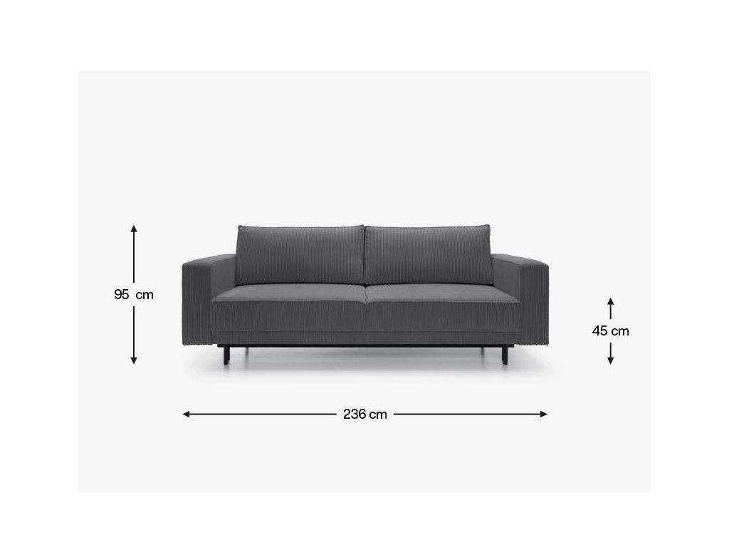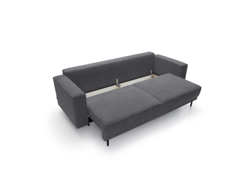 Jeho jednoduchý, elegantní tvar a masivní kovové nohy dodávají konstrukci lehkost a zároveň zajišťují stabilitu. Tento model vyniká nejen svou estetikou, ale také praktickými řešeními, která zvyšují pohodlí každodenního používání. Pohovka disponuje funkcí spaní s intuitivním mechanismem DL, který umožňuje rychlé a snadné rozložení. Jednoduše jemně vytáhněte sedák a sklopte opěradlo, čímž vytvoříte prostornou plochu pro relaxaci. Další výhodou je prostorný prostor na ložní prádlo skrytý pod sedákem, který pohodlně ukládá peřiny, polštáře a deky, což pomáhá udržovat obývací pokoj uklizený.