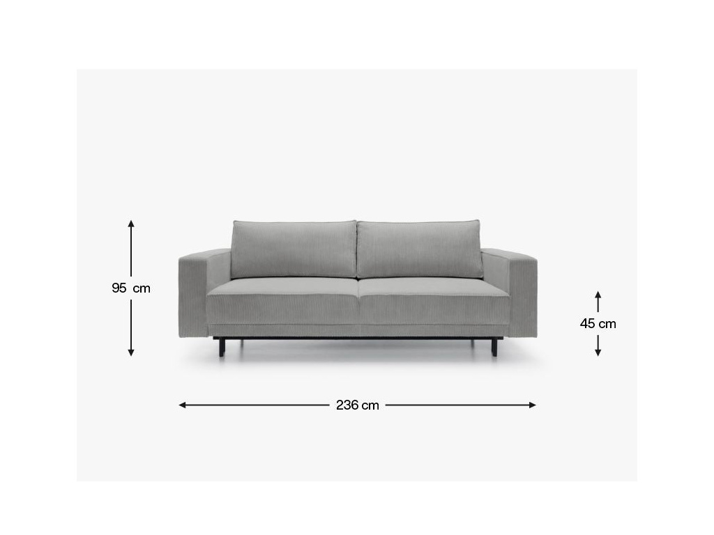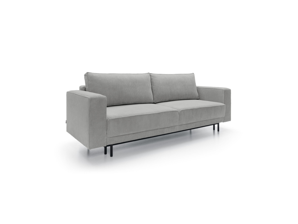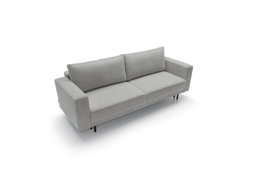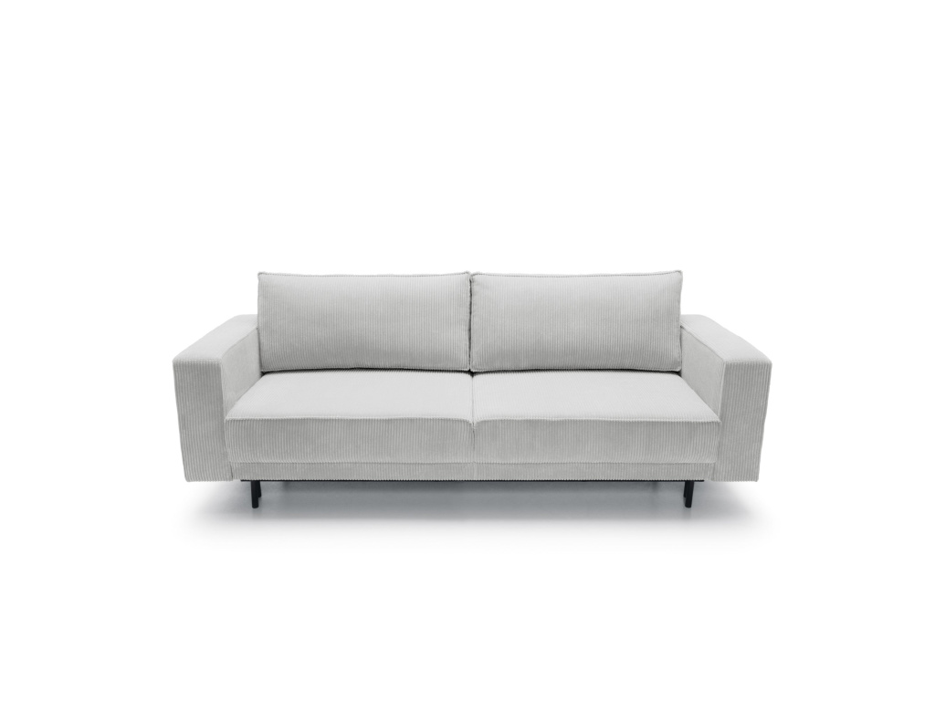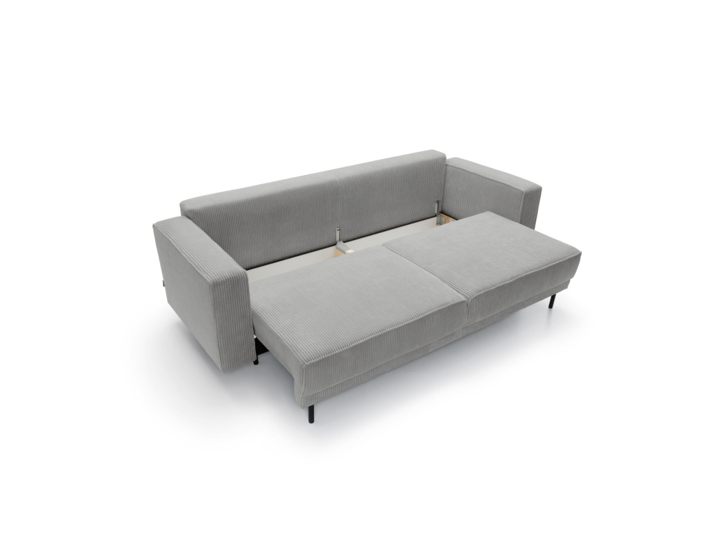 Jeho jednoduchý, elegantní tvar a masivní kovové nohy dodávají konstrukci lehkost a zároveň zajišťují stabilitu. Tento model vyniká nejen svou estetikou, ale také praktickými řešeními, která zvyšují pohodlí každodenního používání. Pohovka disponuje funkcí spaní s intuitivním mechanismem DL, který umožňuje rychlé a snadné rozložení. Jednoduše jemně vytáhněte sedák a sklopte opěradlo, čímž vytvoříte prostornou plochu pro relaxaci. Další výhodou je prostorný prostor na ložní prádlo skrytý pod sedákem, který pohodlně ukládá peřiny, polštáře a deky, což pomáhá udržovat obývací pokoj uklizený.