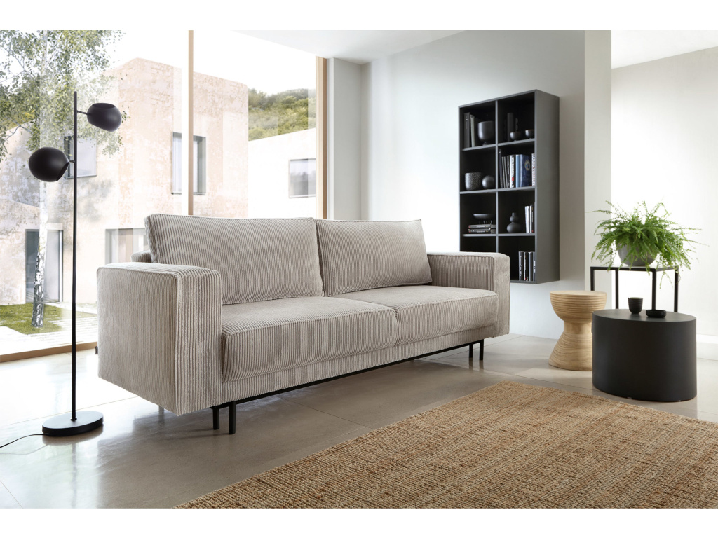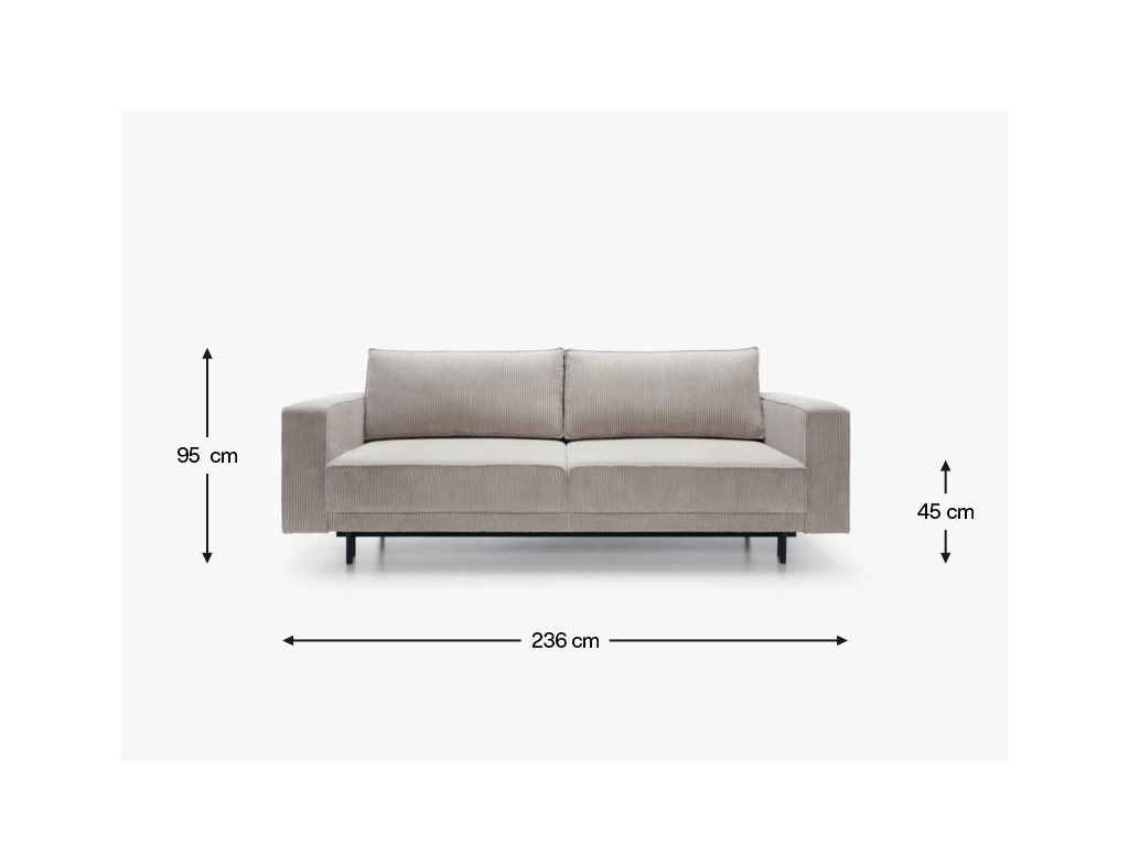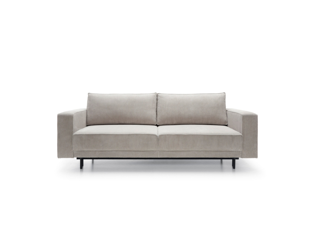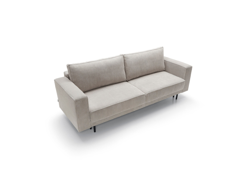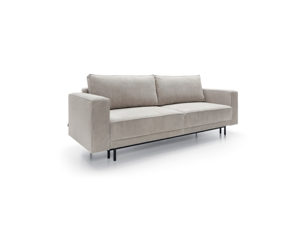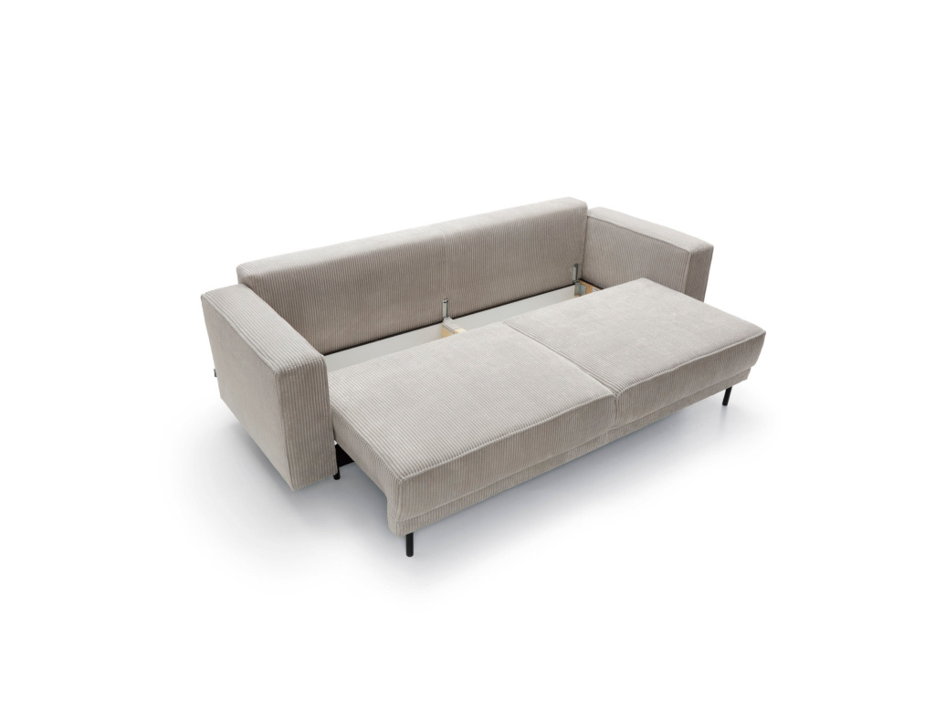 Jeho jednoduchý, elegantní tvar a masivní kovové nohy dodávají konstrukci lehkost a zároveň zajišťují stabilitu. Tento model vyniká nejen svou estetikou, ale také praktickými řešeními, která zvyšují pohodlí každodenního používání. Pohovka disponuje funkcí spaní s intuitivním mechanismem DL, který umožňuje rychlé a snadné rozložení. Jednoduše jemně vytáhněte sedák a sklopte opěradlo, čímž vytvoříte prostornou plochu pro relaxaci. Další výhodou je prostorný prostor na ložní prádlo skrytý pod sedákem, který pohodlně ukládá peřiny, polštáře a deky, což pomáhá udržovat obývací pokoj uklizený.